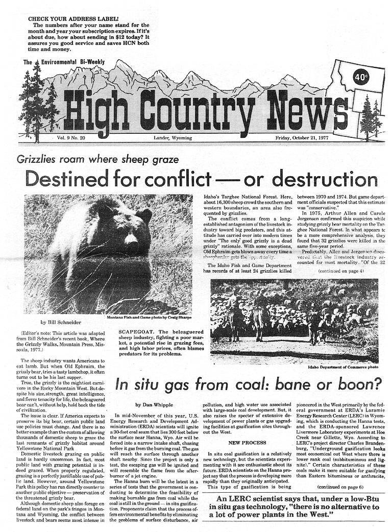 A front-page feature about the conflict between grizzly bears and Idaho sheep ranchers just outside of Yellowstone was an especially hot topic in 1977. The story reported that for years, Frank DeShon, a game biologist for the Idaho Fish and Game Department had been trying to solve the conflict that was having a devastating effect on these charismatic creatures. The previous year, 28 grizzly bears on the Targhee National Forest had been killed because they’d been identified as eating livestock.