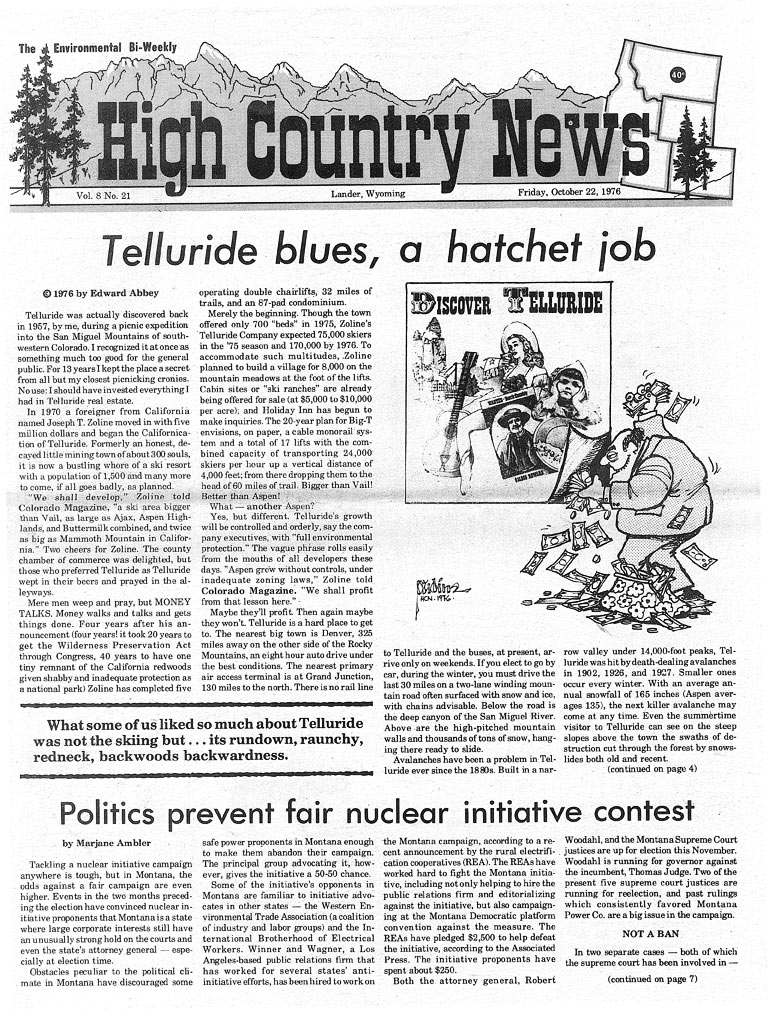 Several issues later an essay by Abbey, Telluride blues, a hatchet job, appeared on the cover in which Abbey bemoaned the “Californication” of Telluride, Colo. “Formerly an honest, decayed little mining town of about 300 souls, it is now a bustling whore of a ski resort with a population of 1,500 and many more to come,” he groused. Classic Abbey.