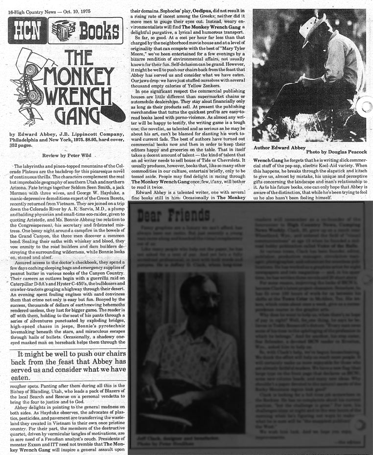 A less than flattering review of The Monkey Wrench Gang by Arizona poet and English professor Peter Wild inspired several months of lively debate in 1975. Wild wondered whether Abbey had bowed to commercial publishing houses looking to turn a fast profit with “easy-to-read books laced with porno-violence.”