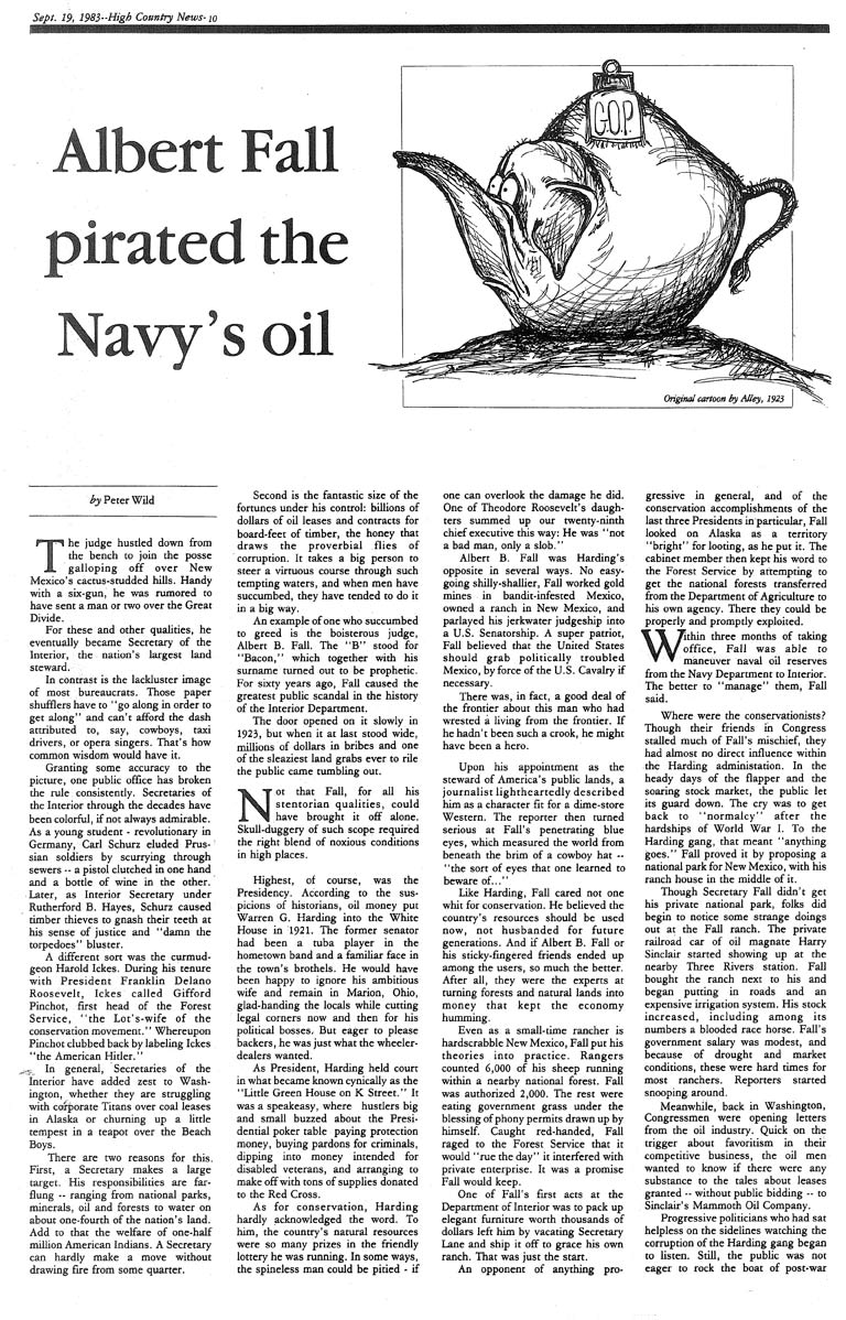 In the Sept. 19, 1983 issue of High Country News, Peter Wild wrote in an article titled “Albert Fall pirated the Navy’s oil” that throughout history Interior Department secretaries have consistently been colorful, if not always admirable.