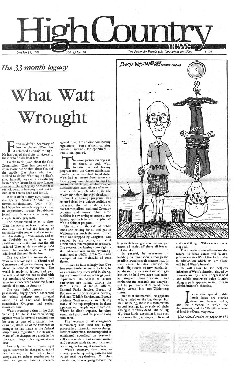 But Watt’s off-the-cuff gaffes were minor compared to his ruthless efforts to give industry and pro-development factions unbridled access to the nation’s public lands. On the heels of his resignation, High Country News dedicated an entire issue, titled “What Watt wrought” to analyzing his 33-month tenure and what it meant for the West and its future, a future that’s playing out today. Articles from around the region told of his undoing of the agency. (Cover image at left, or click here to download the seven-page article package as a pdf.)